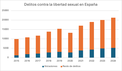En España, en lo que llevamos de año ha habido 2.655 agresiones con penetración (violación). Un 7 % más que el año anterior en el mismo periodo [3]. En 2024 hubo 2.465 y en 2023 2.305, esto refleja una verdad abrumadora, y es que cada año se incrementan los casos de violaciones en todo el territorio.